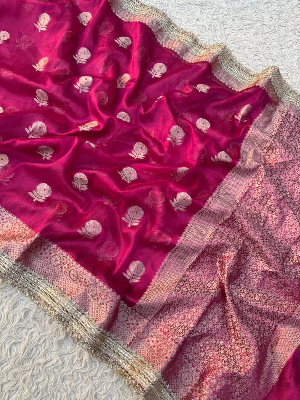 BEAUTIFUL BANARAS SOFT GLASS TISSUE SILK WOVEN LACE WORK WITH MEENAKARI BOOTA SAREES