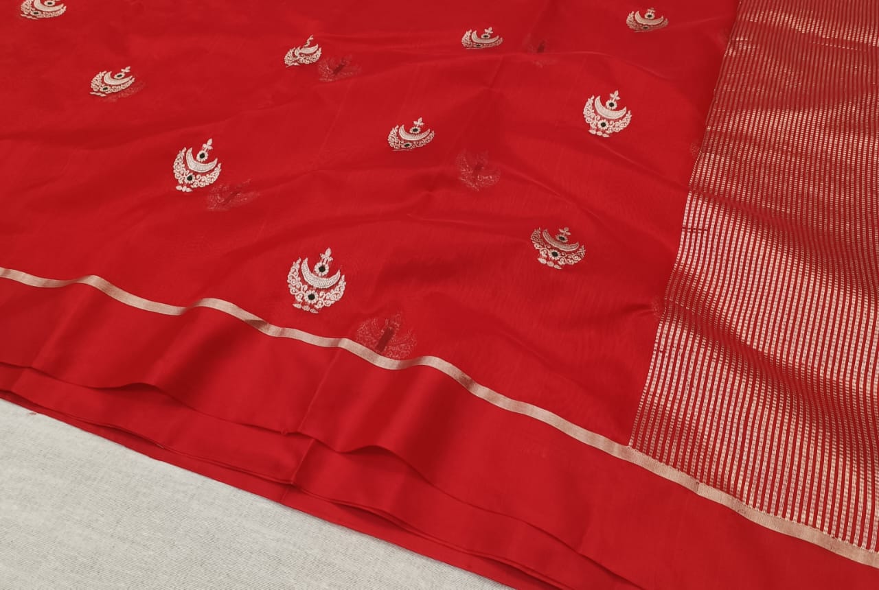 Pattu Silk Meenakari Kadwa Butta Chanderi Handloom Saree with Resham Border & Taraz Palla